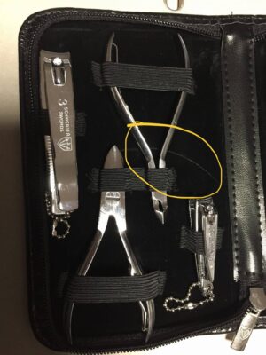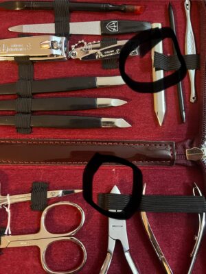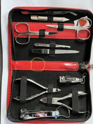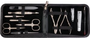 Zestaw pięciu narzędzi do manicure zapakowanych w fantazyjne etui.