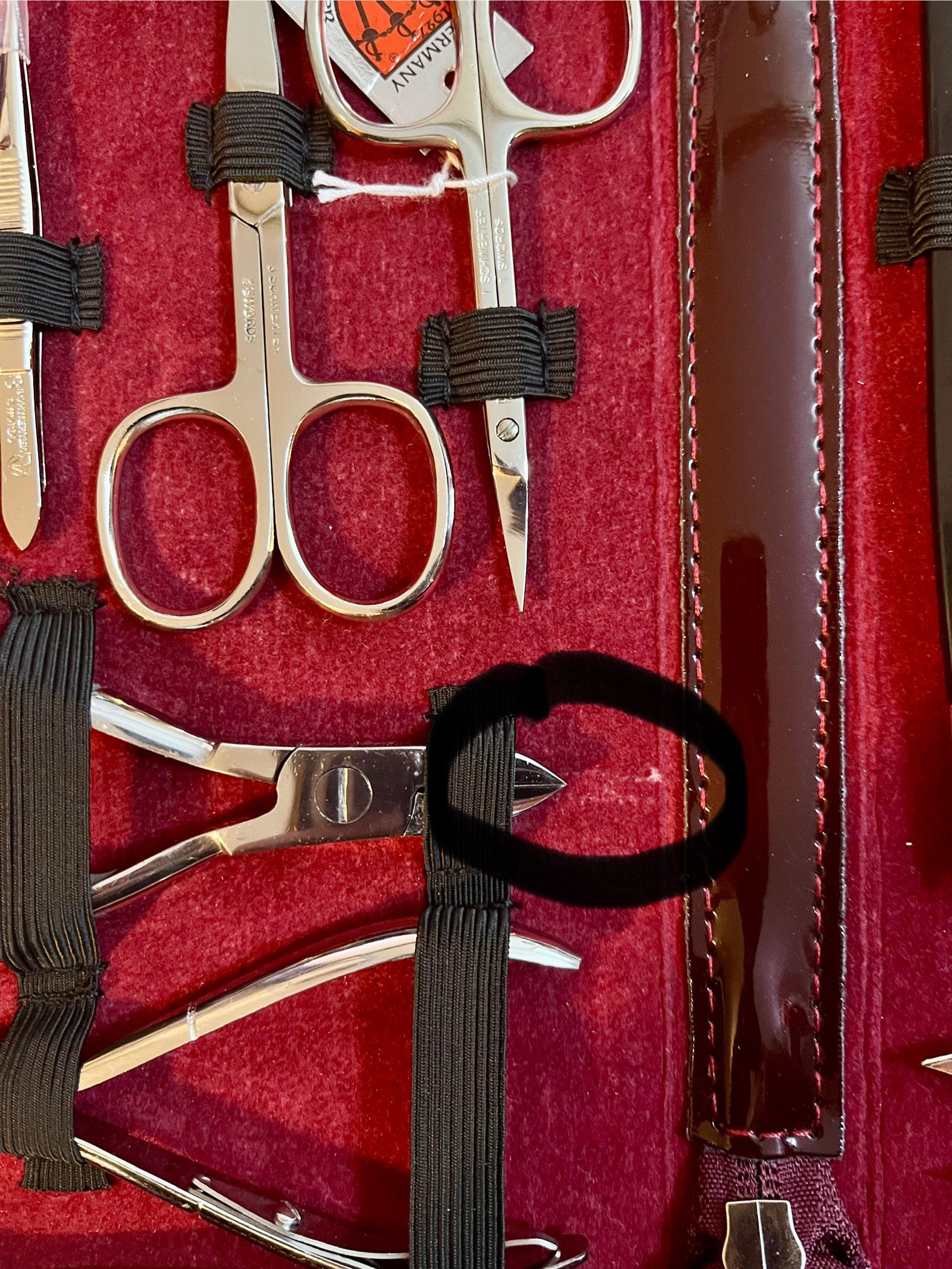 ⭐Duży, 16-częściowy zestaw narzędzi do pielęgnacji paznokci w bordowym etui z lakierowanej ekoskóry. Cążki do skórek i paznokci, nożyczki, pilniczki i wiele innych. 5851 MC N