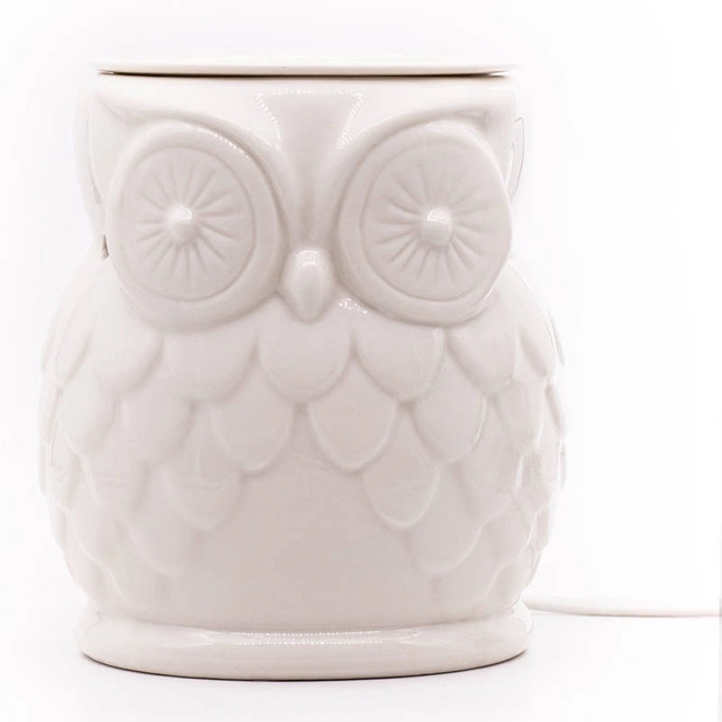 Elektryczny biały ceramiczny kominek do wosków zapachowych w kształcie sowy.