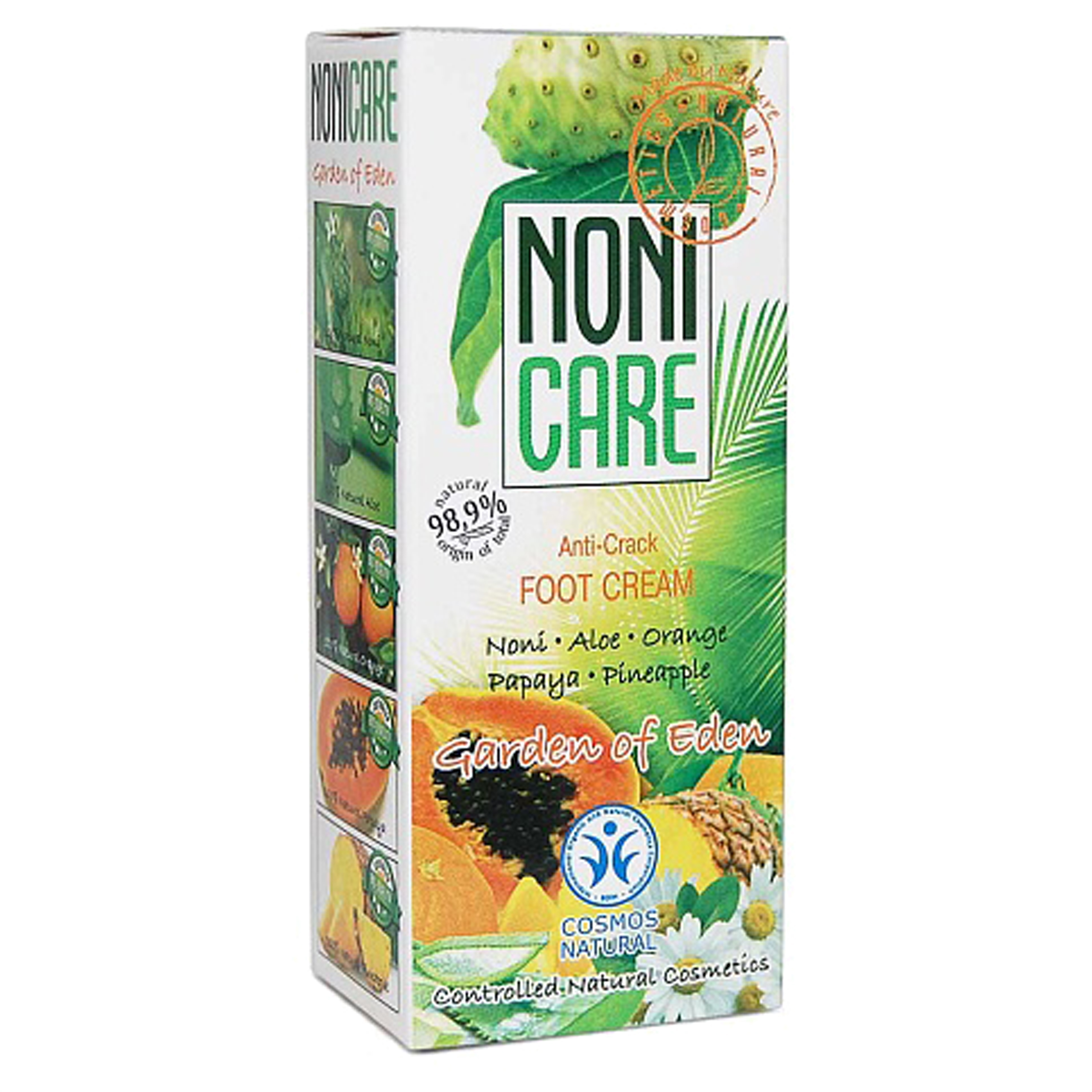 Krem do stóp Noni Care jest kosmetykiem naturalnym i nie zawiera: parabenów, silikonów, SLS, parafiny, olejów mineralnych, syntetycznych barwników i aromatów. Składniki pochodzenia roślinnego, które znajdziemy w kremie to: