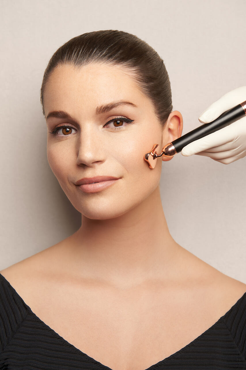 Profesjonalne urządzenie do masażu twarzy łączące mikrowibracje, akupresurę i drenaż limfatyczny dla jędrnej i promiennej skóry.