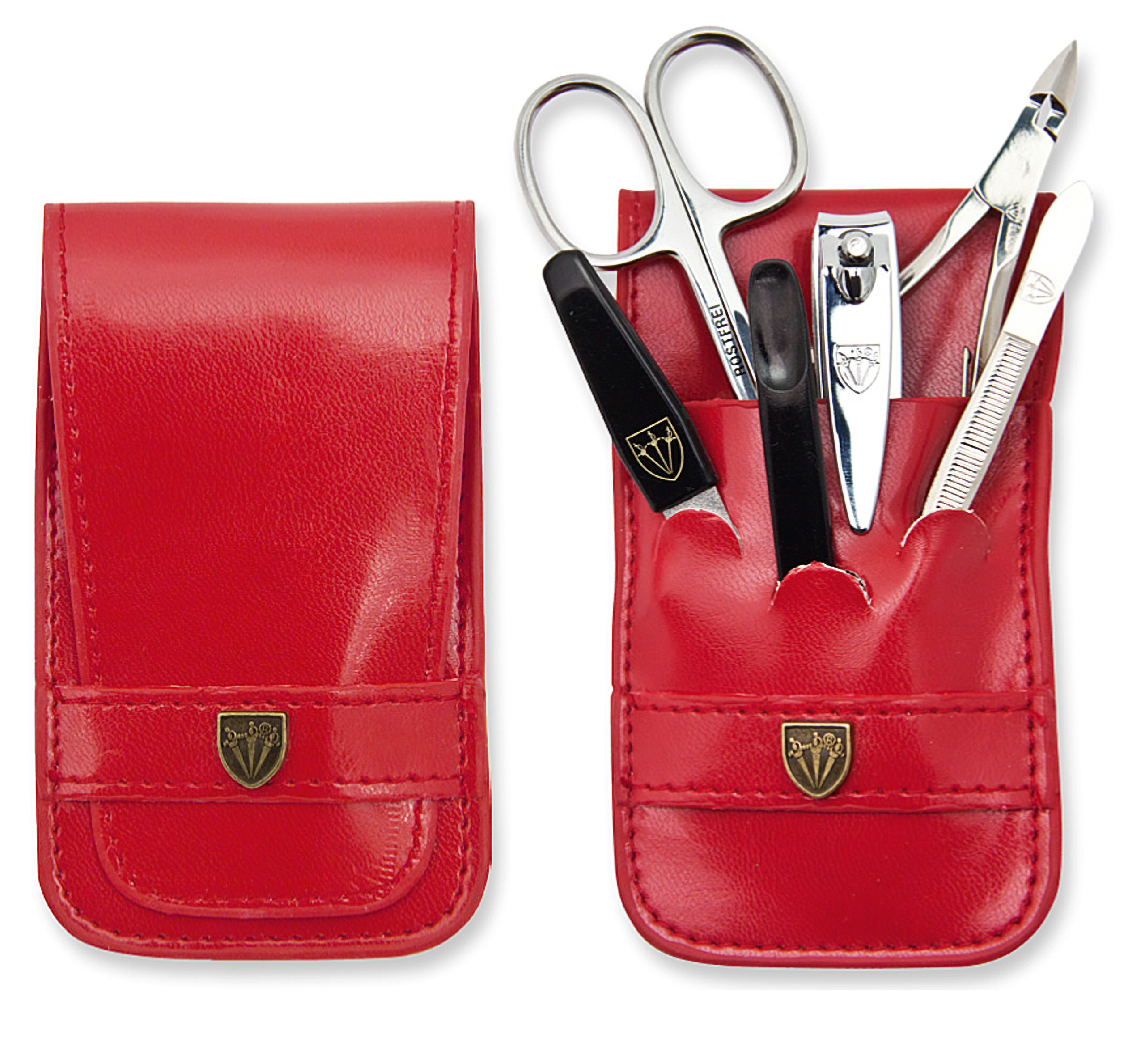 To zestaw narzędzi do pielęgnacji paznokci zamknięte w eleganckim etui z czerwonej ecoskóry. Kopertowo zamykany futerał ma wymiary 11×7 cm (zamknięty) i skrywa w sobie 6 stalowych narzędzi: