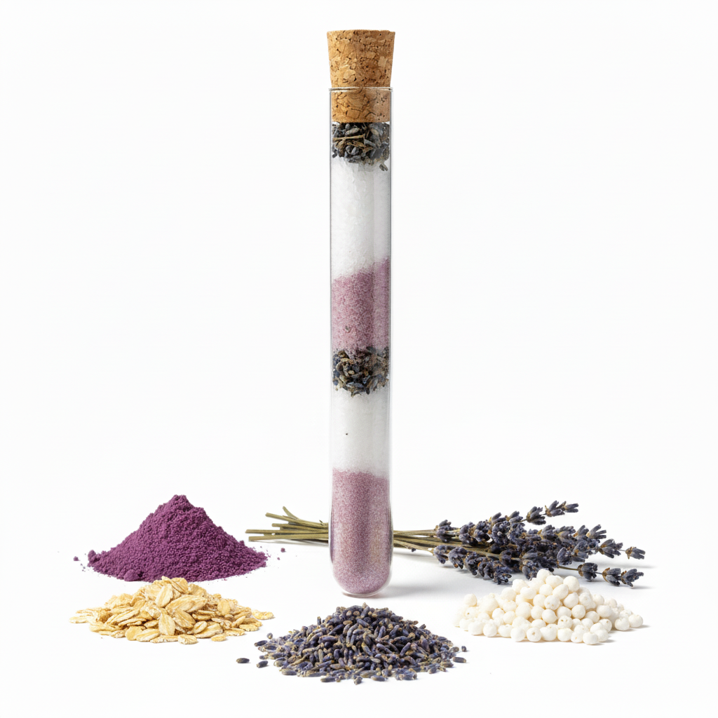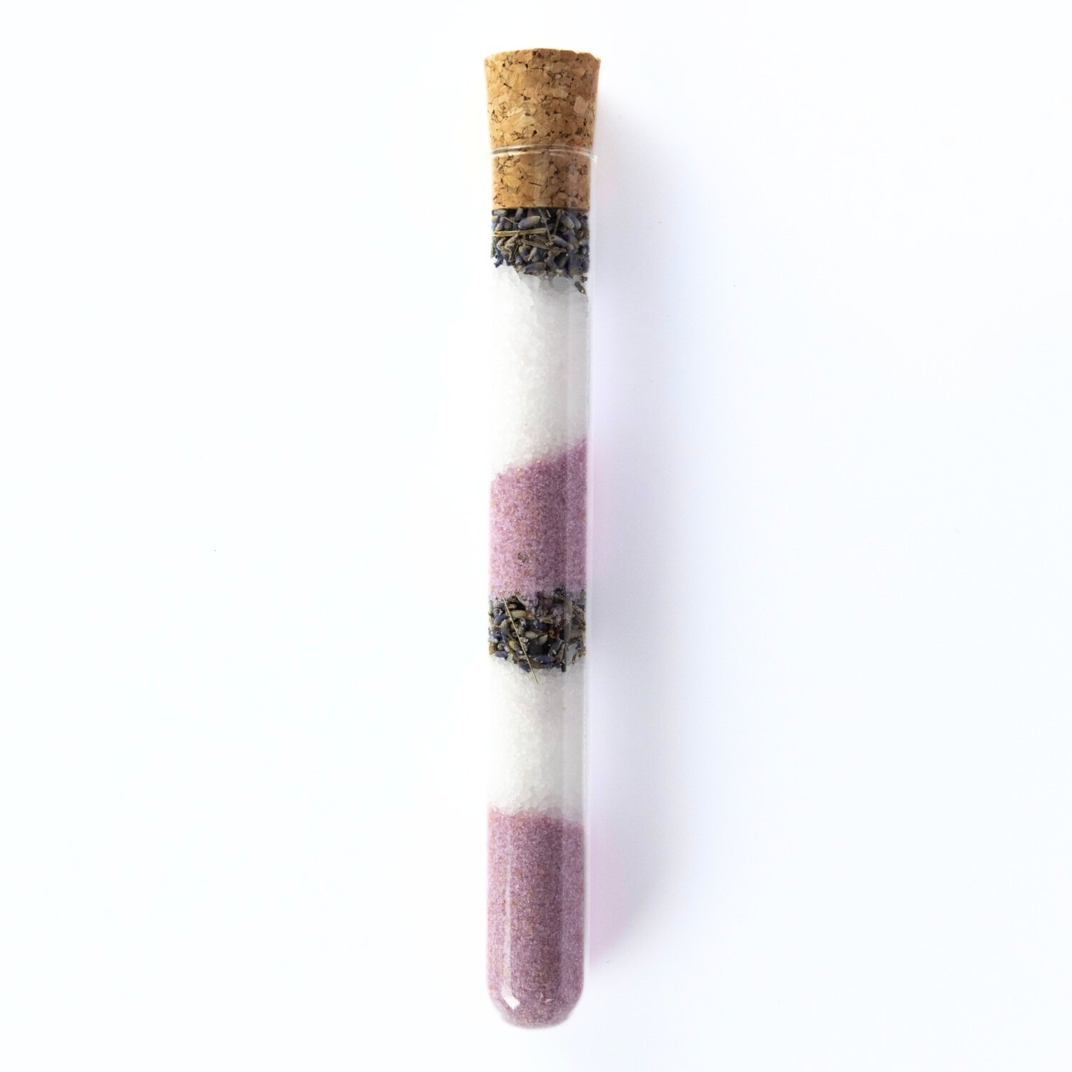 Relaksująca sól do kąpieli z solą Epsom, glinką fioletową i olejkiem lawendowym, otulająca skórę kojącym aromatem lawendy.