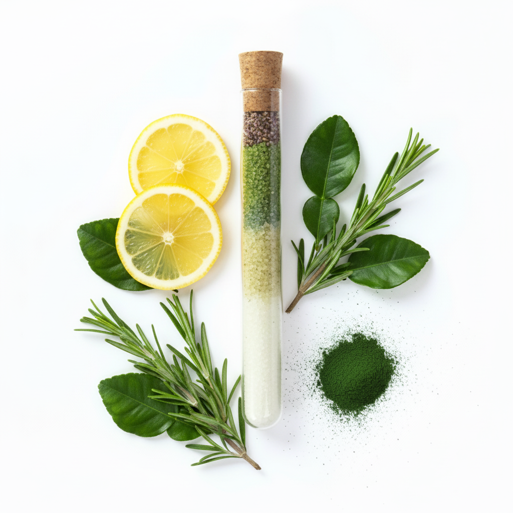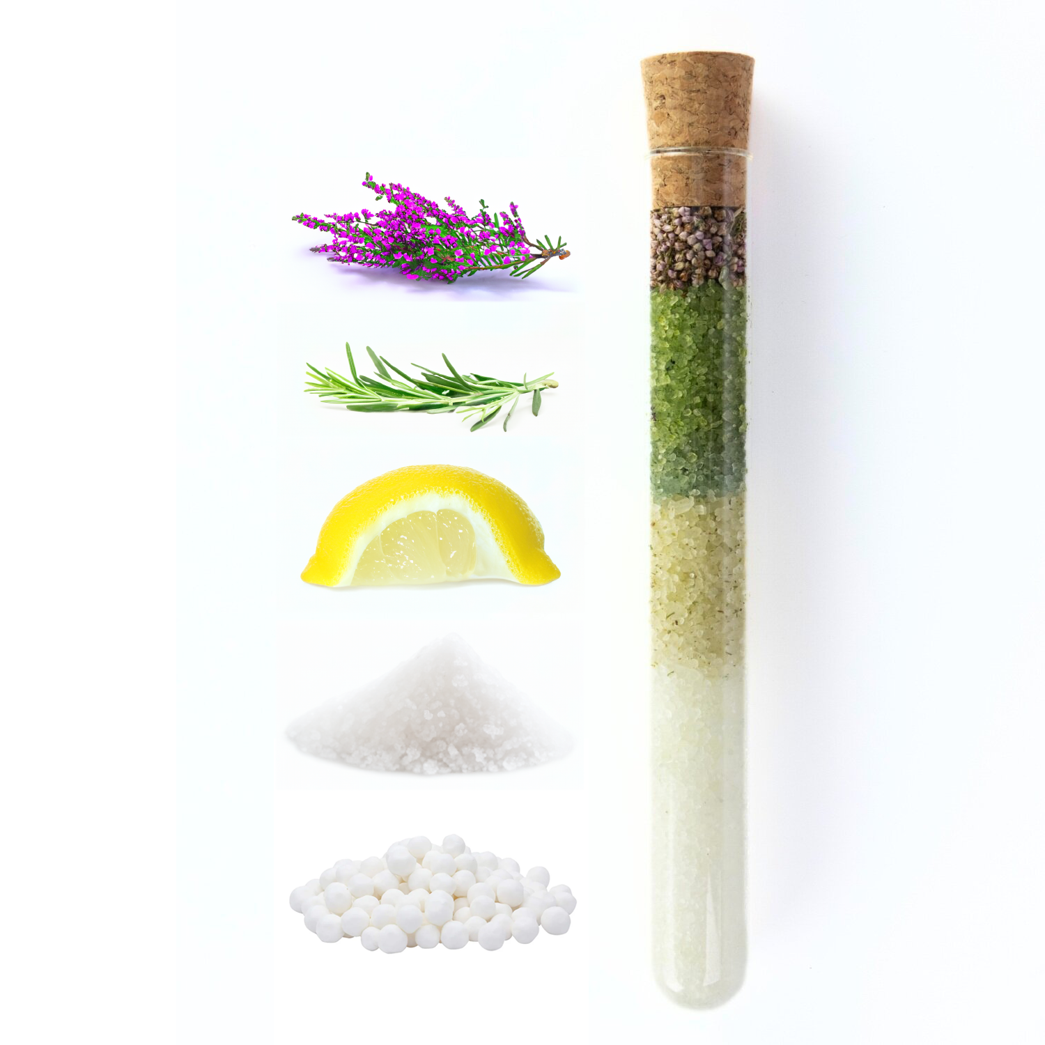 Ingredients: Sodium Chloride (Sea Salt), Tapioca Starch, Rosmarinus Officinalis Leaf Oil, Citrus Aurantium Bergamia Fruit Oil, Citrus Limon Peel Oil, Calluna Vulgaris Flower, Rosmarinus Officinalis Leaf, Spirulina Platensis, Citral*, Geraniol*, Linalool*, Limonene*