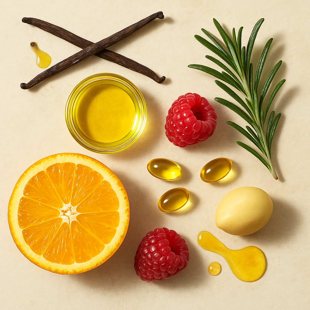 | Składniki aktywne | Olej makadamia, Olej z pestek malin, Koenzym Q10, Olejek z bergamotki, Olejek rozmarynowy, Olej waniliowy, Olej sezamowy, Palmitynian retinylu (witamina A) |