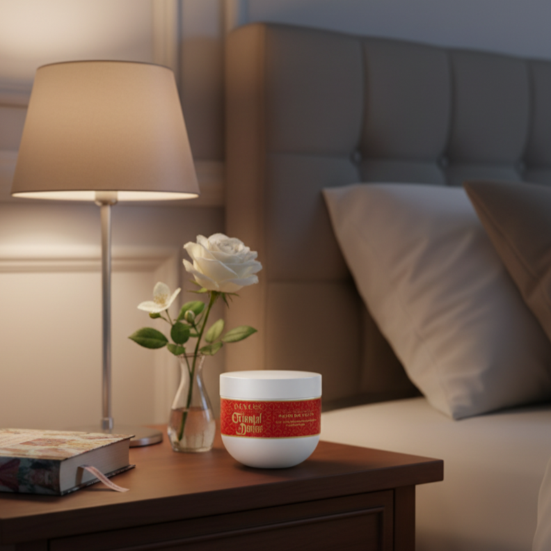 Każdy składnik ORIENTAL DANCE został starannie wybrany, aby dostarczyć Twojej skórze wszystkiego, co najlepsze. Masło shea głęboko odżywia i regeneruje, podczas gdy olej migdałowy wygładza oraz wspomaga elastyczność skóry. Dodatkowo, naturalny cetearyl alcohol zmiękcza skórę, a paraffinum liquidum sprzyja zatrzymywaniu wilgoci. Całość dopełnia oryginalna kompozycja zapachowa z jaśminem, szafranem, wanilią i ambra, która otula skórę zmysłowym aromatem.