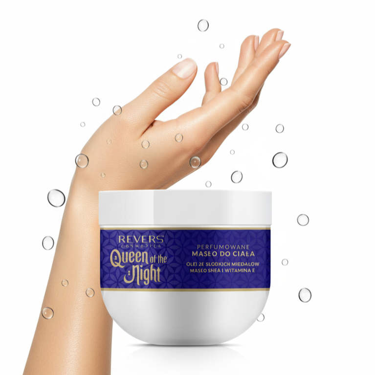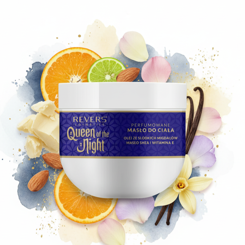 Revers QUEEN OF THE NIGHT perfumowane masło do ciała 250 ml to wyjątkowy produkt, który łączy intensywną pielęgnację z eleganckim zapachem. Przeznaczone do codziennego użytku, masło to wzbogaca skórę w niezbędne składniki odżywcze, oferując jednocześnie zmysłowy aromat, który utrzymuje się przez długi czas. Dzięki wyjątkowej formule, skóra staje się gładka, nawilżona i pełna blasku.