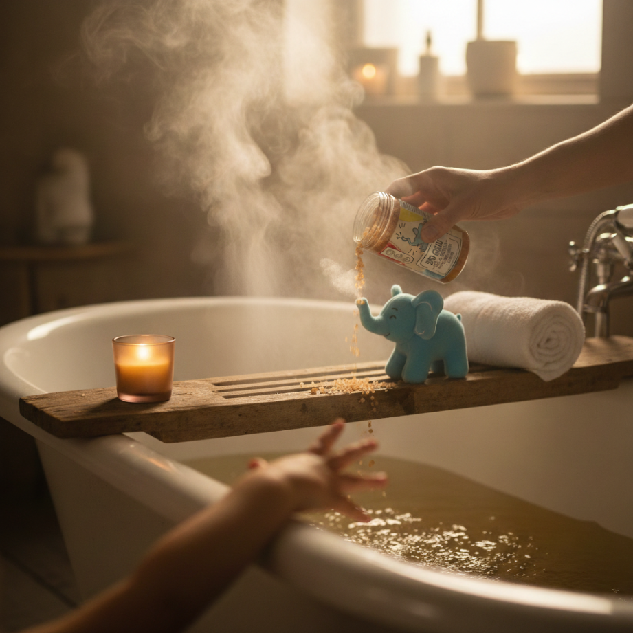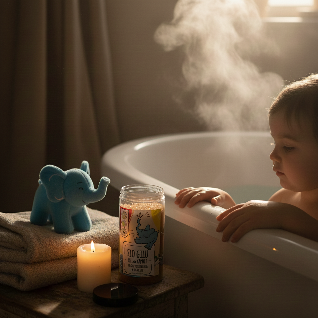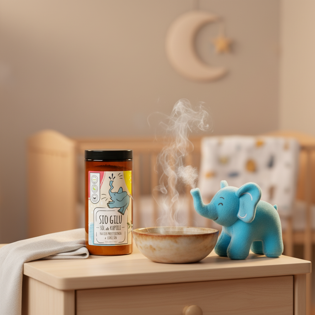 Naturalna, wegańska sól do kąpieli dla maluchów od 1. roku życia z bezpiecznymi olejkami eterycznymi, która ułatwia oddychanie, wycisza przed snem i pielęgnuje skórę.