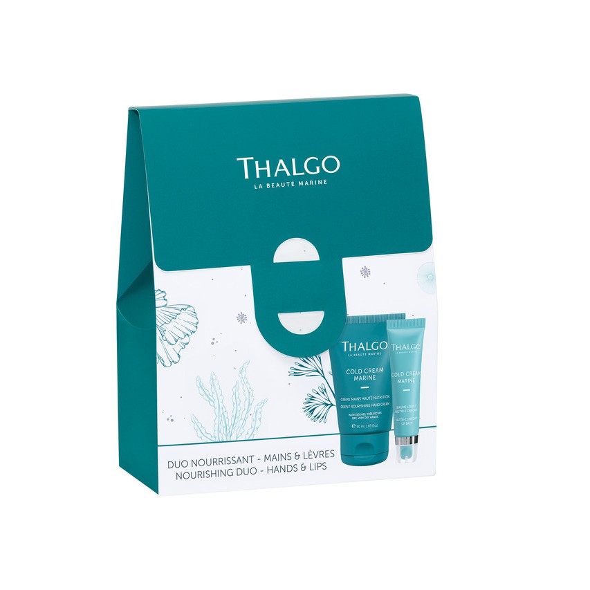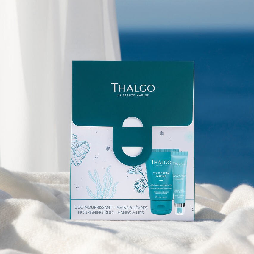Profesjonalny duet Thalgo intensywnie odżywiający dłonie i usta, zapewniający 24h nawilżenie, regenerację i ochronę przed przesuszeniem.
