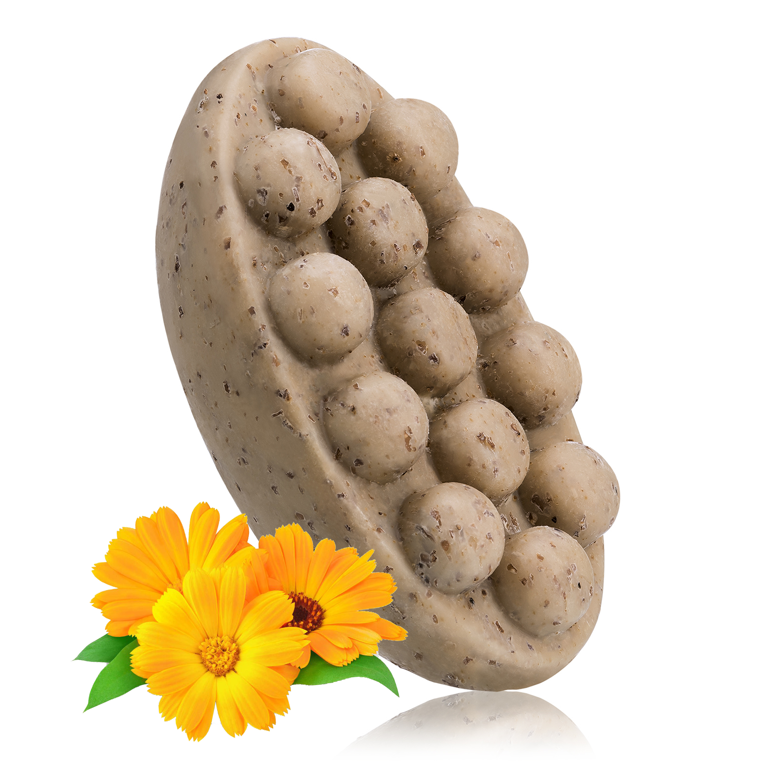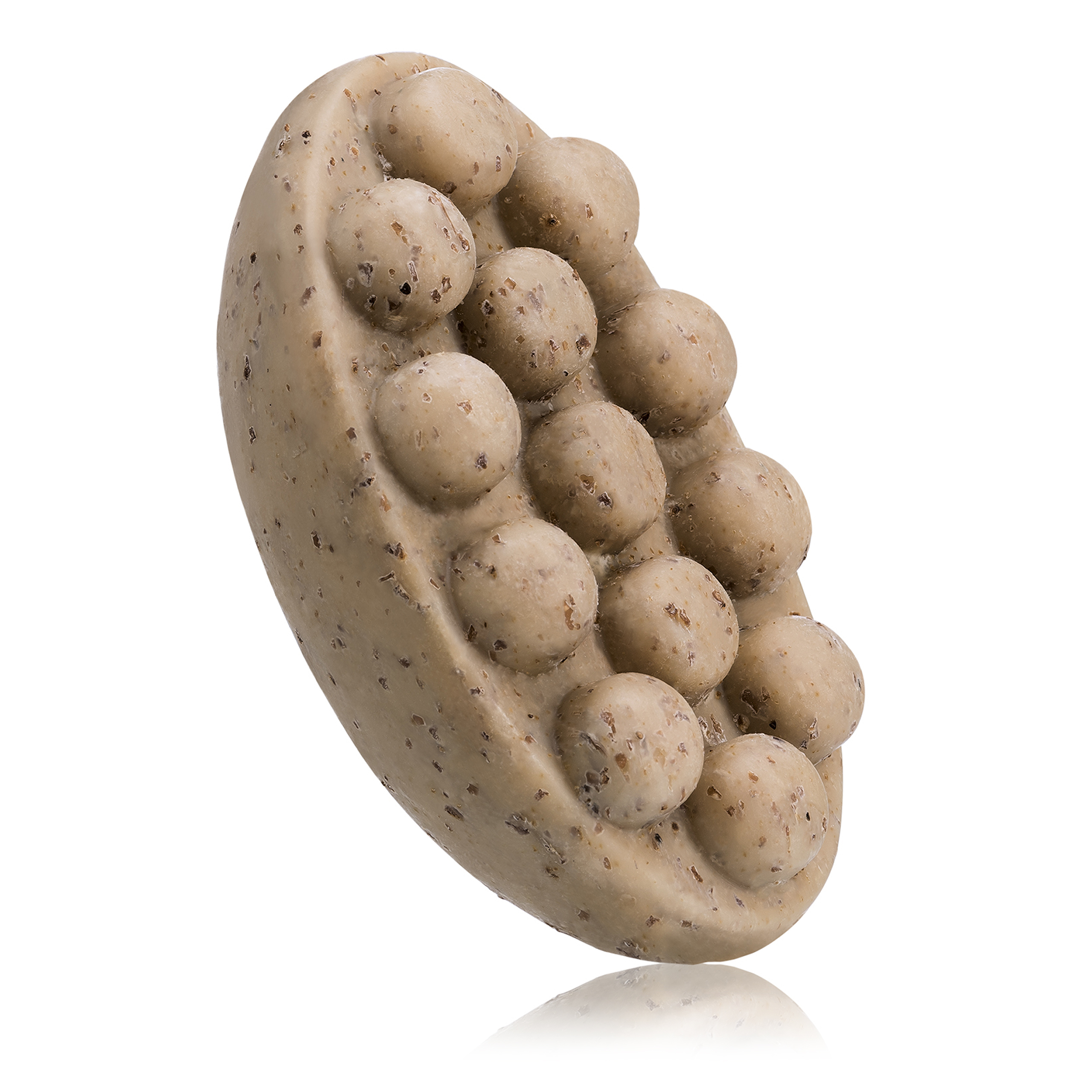 Ergonomiczny kształt mydełka z wypustkami umożliwia relaksujący masaż podczas kąpieli, co pozytywnie wpływa na mikrokrążenie. Oferuje bezpieczną formułę, wolną od parabenów, silikonów, PEG-ów i siarczanów, w której 91% składników pochodzi z natury.