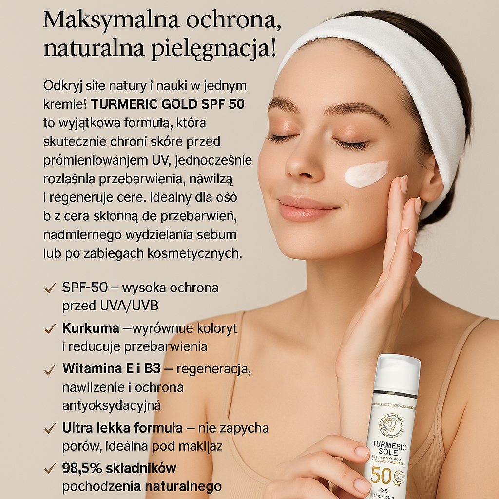 TURMERIC GOLD krem do twarzy to innowacyjny kosmetyk, który łączy w sobie moc naturalnych składników oraz nowoczesną ochronę przeciwsłoneczną. Dzięki mineralnemu filtrowi 50UV, Twój skóra zyskuje optymalną ochronę przed promieniowaniem UVA i UVB, jednocześnie ciesząc się prestiżowymi właściwościami kurkumy, która działa łagodząco i nawilżająco. To doskonały wybór dla osób pragnących zainwestować w kompleksową pielęgnację twarzy każdego dnia.