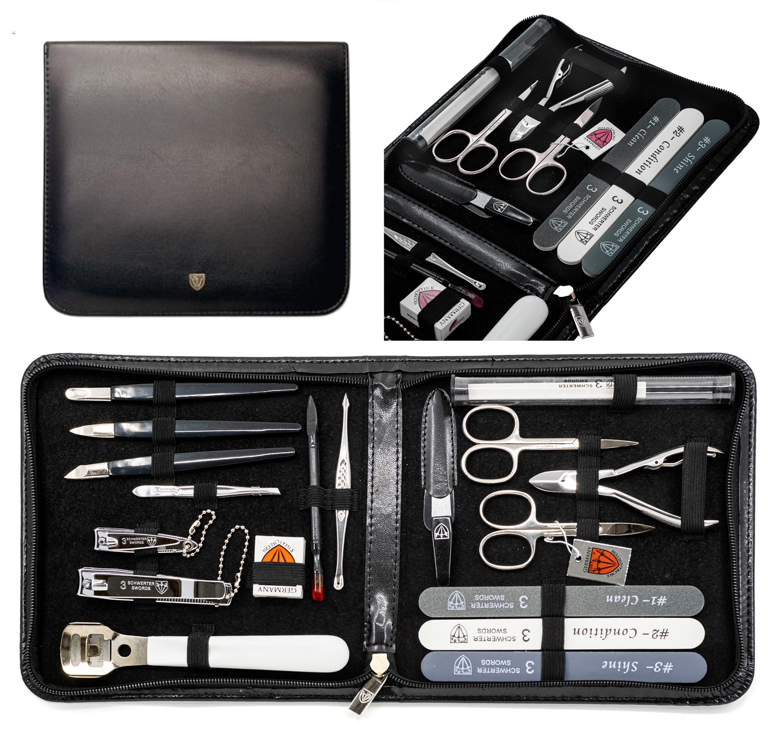| Zestaw zawiera | Pilniczek, Cęgi do paznokci, Kopytko, Nożyczki do paznokci, Nożyczki do skórek, Obcinacz do paznokci – duży, Obcinacz do paznokci – mały, Odpychacz do skórek, Pęseta, Dwustronne narzędzie do skórek i czyszczenia paznokci, Usuwacz Zaskórników, 10 żyletek |