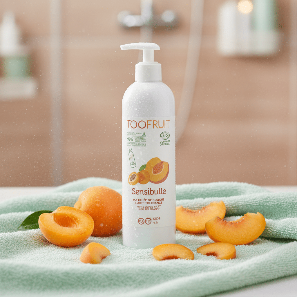 Ultrałagodny żel pod prysznic dla dzieci z morelą i brzoskwinią – delikatnie oczyszcza, nawilża i otula skórę owocową świeżością.