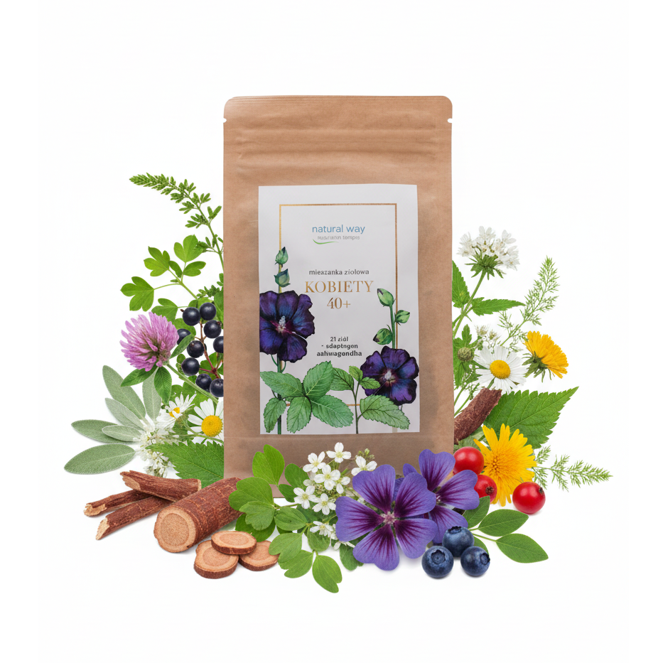 Ziołowa herbata dla kobiet 40+ Natural Way 90 g to unikalna mieszanka 21 ziół, wzbogacona o adaptogen – ashwagandhę, stworzona z myślą o kobietach w wieku 40+. Formula herbata wspiera naturalną równowagę oraz komfort w okresie menopauzy, oferując chwilę relaksu w codziennym życiu. Każda filiżanka to krok ku zdrowemu i harmonijnemu stylowi życia.